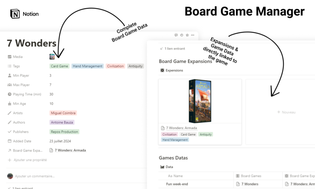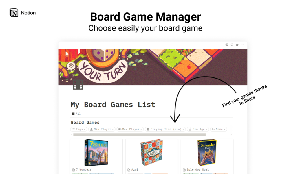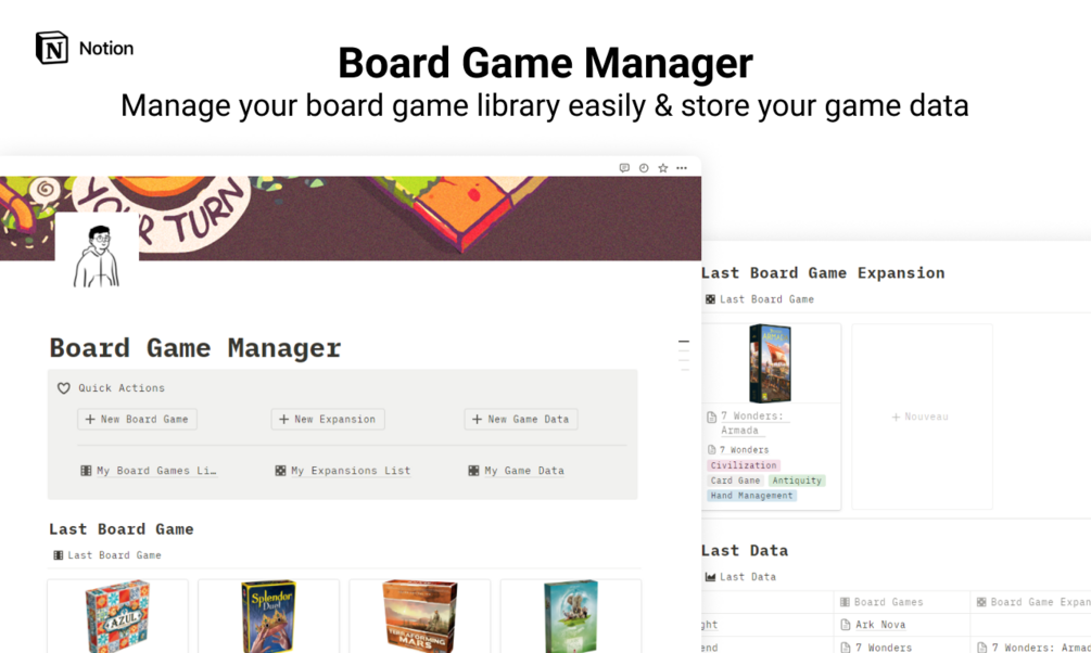 Transform the management of your board games with our Notion Template, designed specifically for board game enthusiasts. Whether you're an avid collector or a casual player, this template helps you organize, search, and record all the essential information about your games and sessions.