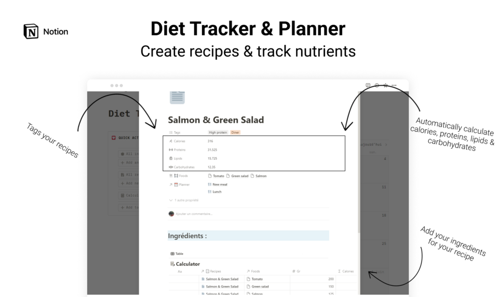 But also create recipes, calculate calories / carbohydrates / lipids / proteins by ingredients and plan your meal prep. All this in one place !